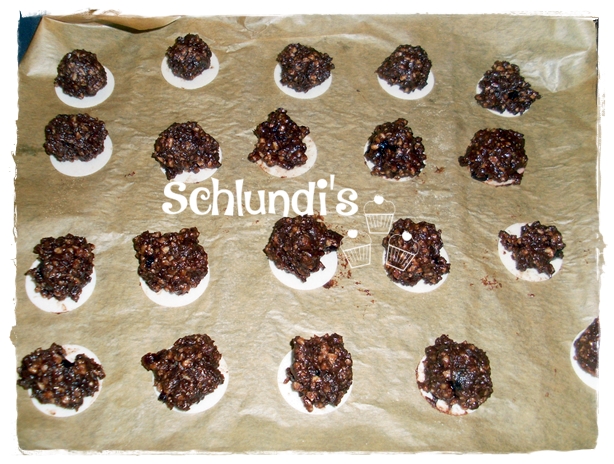 Mit den Händen etwa nussgroße Stücke abnehmen und in jedes Stückchen eine Amarenakirsche drücken, leicht zur Kugel formen und auf eine Oblate setzen. Falls nicht ganz soviel Kirschen im Glas sind, das variiert – einfach ein paar auseinanderschneiden.