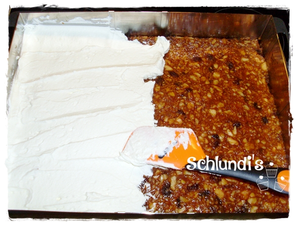 Kuchen kühlstellen – anschließend die geschlagene Sahne darauf verteilen – ich persönlich schlage meine Sahne immer noch mit meinem Mixer…..