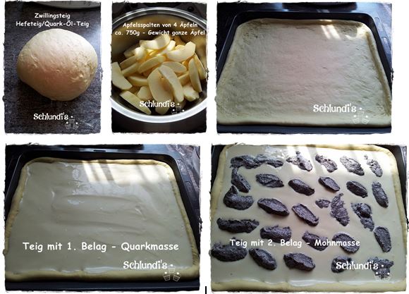 Den Teig nochmal ca. 15-20min. ruhen lassen. Anschließend dann zu erst die Quarkmasse auf den Teig geben, dann die Mohnmasse löffelweise in den Quarkmasse setzen und am Schluß mit den Apfelspalten belegen.
