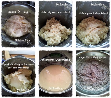 Den Teig dann einfach im Mixtopf ruhen lassen. Wenn er sich ca. verdoppelt hat, den Quark-Ölteig auf 3 Portionen auf den Hefeteig geben