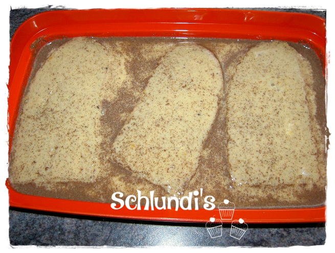 Die Marinade in eine flache Schüssel geben und das in Scheiben geschnittene Brot oder das Toastbrot reinlegen.
