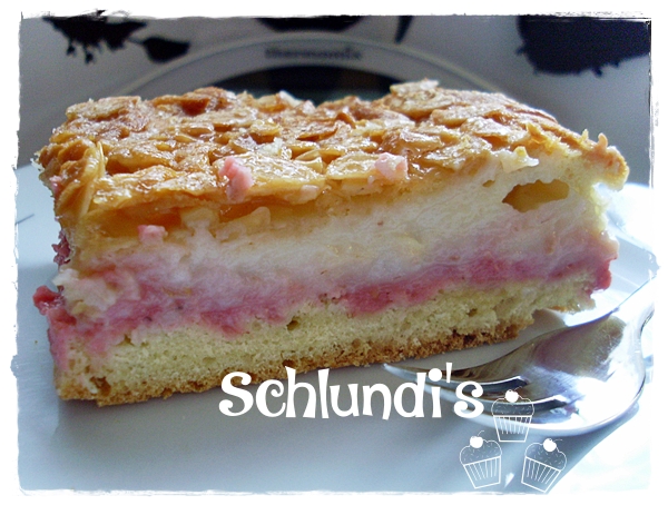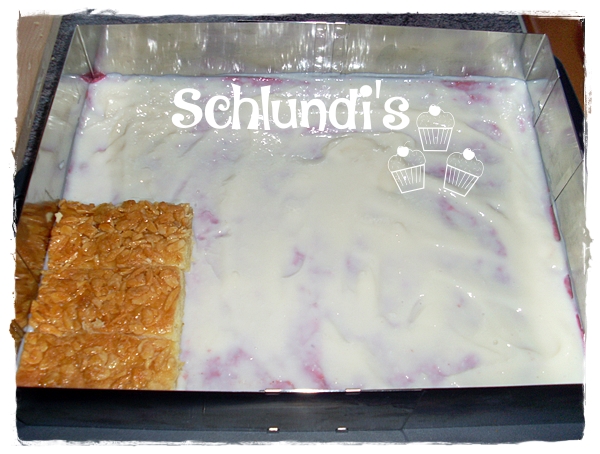 Im Anschluß dann zuerst die Himbeerpuddingmasse aufstreichen, dann den Mandelpudding und am Schluß den „Deckel“ bereits in Stücken geschnitten auflegen.