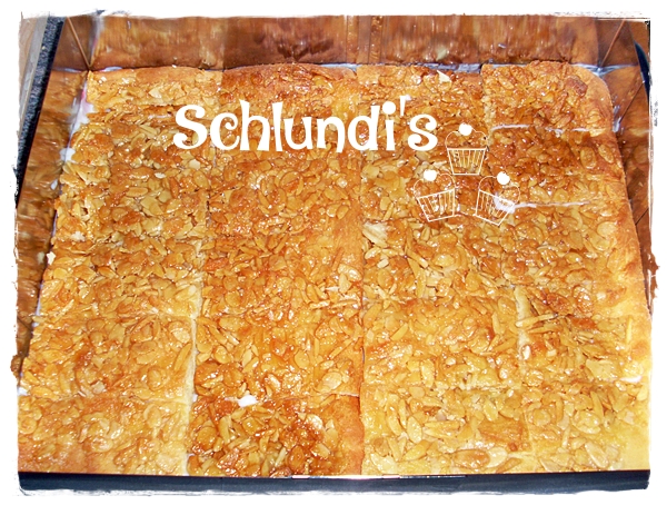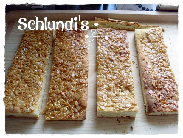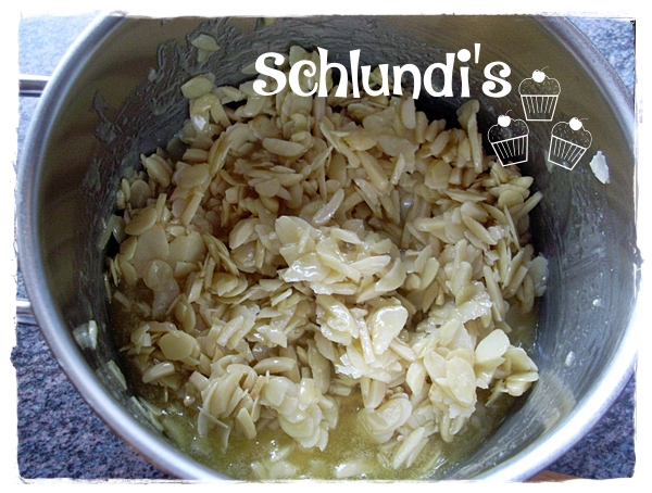 Den Belag hab ich in einem Töpfchen auf dem Herd gekocht. Butter bei niedriger Temperatur vorsichtig schmelzen, Zucker Honig und Sahne zugeben, zum Kochen bringen, dann die Mandeln einrühren und vom Herd nehmen.
