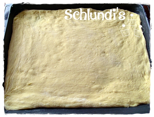 Den Teig dann auf eine bemehlte Arbeitsfläche legen einmal kurz durchkneten und auf Blechgröße ausrollen, oder direkt auf einem gefetteten Backblech ausrollen.