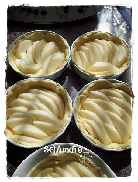 Backofen auf 180°C Umluft aufheizen und die Tartelettes ca. 20-25 Min. goldbraun backen. Wer in einer großen Form bäckt, muß als Backzeit ca. 35-40 Min. rechnen.