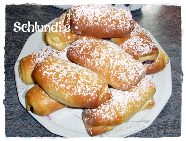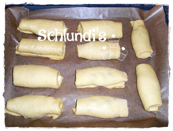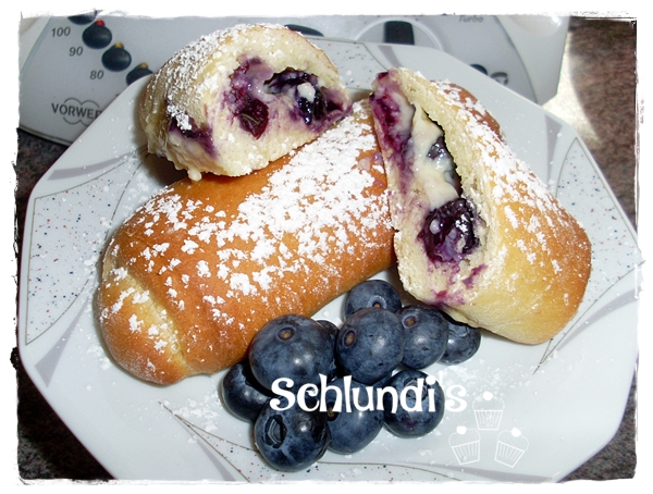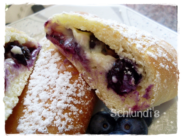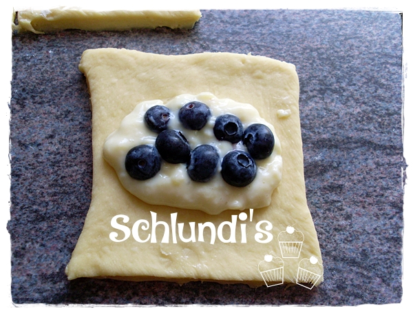 Anschließend auf jedes Quadrat einen gehäuften EL Pudding geben und mit 6-8 Blaubeeren/Heidelbeeren belegen. Die gegenüberliegenen Seiten des Quadrats ca. 1 cm übereinander legen, so dass eine Rolle entsteht. Die Rolle dann mit dem Verschluß nach unten, auf ein mit Backpapier belegtes Backblech legen, damit die Rolls beim Backen nicht wieder aufgehen und die Füllung austritt.