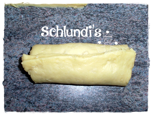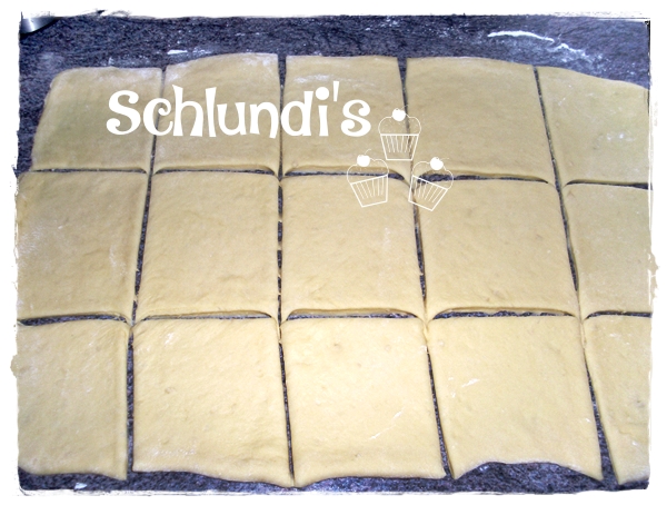Teig zu einem Rechteck ca. 60x40cm ausrollen und in 15 Quadrate teilen, siehe Foto.