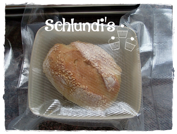 Ich hab dann das Brötchen nach dem völligen Erkalten, in den Vakuumbeutel, ins Gerät eingespannt und auf die Taste „Vakuum&Schweißen“ gedrückt, so lange bis ich gemerkt hab die Luft ist gut raus, dann hab ich die „Stop“ -Taste gedrückt und SOFORT die „Schweißen“ Taste. Somit war fast die ganze Luft raus und der Beutel gut verschlossen. Das ist auch wichtig beim längeren einfrieren, damit sich keine Kristalle bilden – da würde das Brötchen dann aufweichen beim Auftauen.