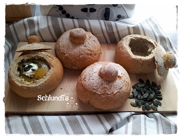 Die Brottassen aus dem Ofen nehmen – soweit abkühlen lassen bis man sie gut anfassen kann, denn den Deckel abschneiden. Mit einem Messer entlang der Kruste (ca. 1 cm Stehen lassen) einmal rundherum, nicht so tief einschneiden und mit einem Esslöffel aushöhlen.