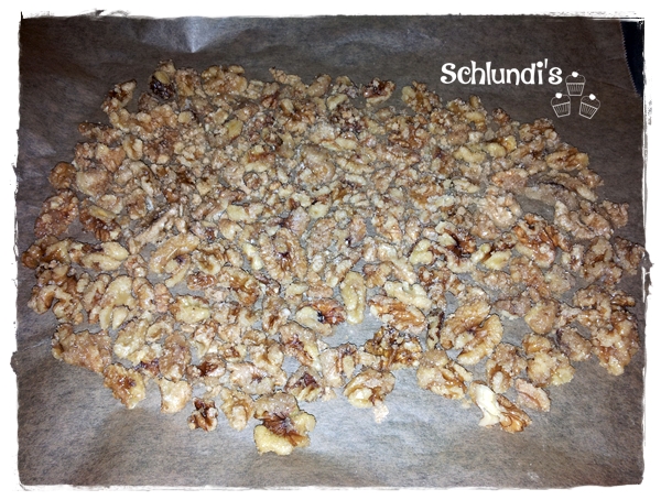 In der Zwischenzeit die Walnüsse karamellisieren. Den Zucker mit dem Wasser in einer Pfanne sehr stark erhitzen, sobald das Zuckerwasser bräunt, die Walnüsse mit dem Stollengewürz dazu geben und unter ständigem Rühren karamellisieren lassen. Die Walnüsse anschließend auf einem Backpapier verteilen damit sie nicht zusammen kleben.