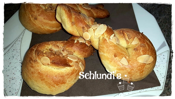 Die fertigen Flachswickel dann auf ein mit Backpapier ausgelegtes Backblech legen, mit Milch bestreichen und mit den Mandelblättchen o.ä. bestreuen.