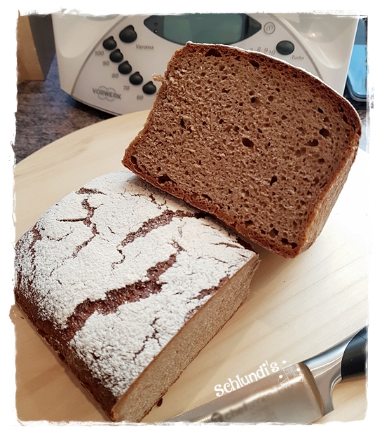 Das Brot auf die unterste Schiene in den Ofen schieben 1/2 MB vom TM schwallartig auf den Boden des Backofens gießen. (Schwaden) und 15 Min. anbacken. Dann die Temperatur auf 180° drosseln, kurz die Ofentüre öffnen und den Dampf entweichen zu lassen. Das Brot weitere 60-70 Min. backen lassen.