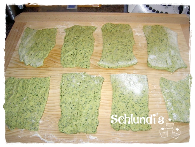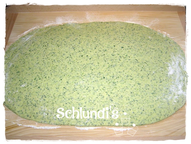 Den Teig dann auf einer bemehlten Arbeitsfläche zu einem Rechteck rausrollen, zu 8 kleinen Rechtecke teilen, die Füllung darauf verteilen und zu kleinen Päckchen rollen.