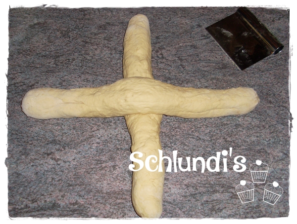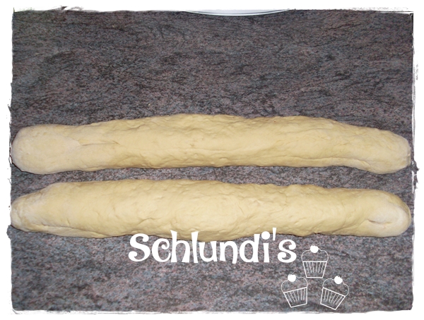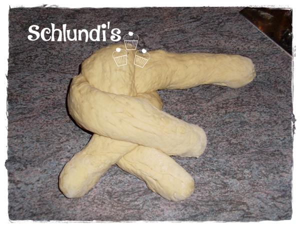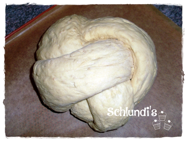 Die Teiglinge auf eine Länge von ca. 40cm wirken und nach Anleitung meiner Bilder zu einem Knoten formen. Knotenenden nach unten einschlagen und das Brot auf ein mit Backpapier ausgelegtem Backblech geben.