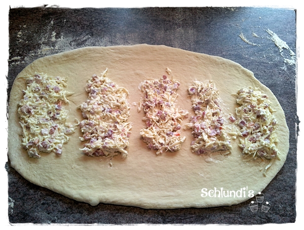 Den Teig dann in zwei Teile geben, noch einmal schön durchkneten und jeweils zu einem Rechteck ca. 20x30cm ausrollen. 2 EL von der Fülle in gleichmäßigen Abständen auf jeden der Teige geben, so dass 5 Teilstücke pro Teigplatte entstehen. Den Teig dann zusammenschlagen, erst die kurzen Enden dann die langen Seiten. Den Brotwickel umdrehen und auf ein mit Backpapier ausgelegtes Backblech legen, nun mit einer Teigkarte die 5 Teilstücke des Handbrotes eindrücken. Das Handbrot bemehlen und jeweils einen Schnitt schräg in die Teilstücke machen.
