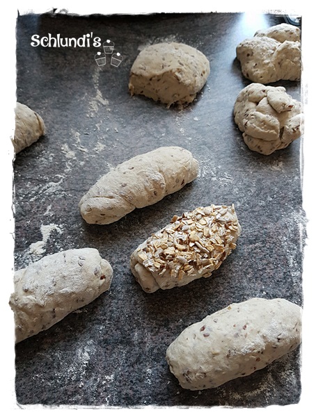 Teig auf eine bemehlte Ablagefläche kippen, 12 Brötchen abstechen, länglich schleifen und kurz entspannen lassen, die Brötchen mit Wasser besprühen und in die Saaten drücken.