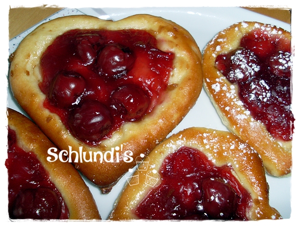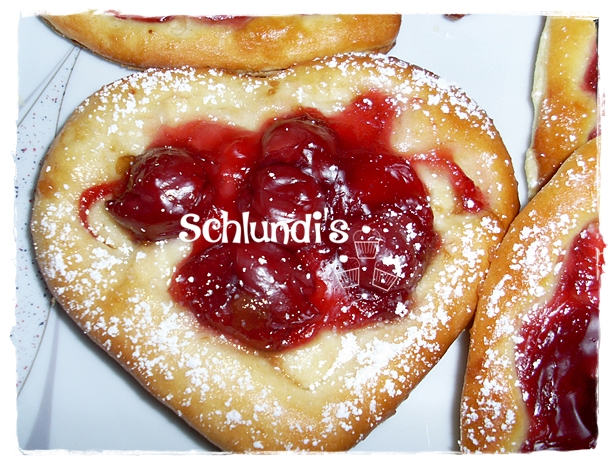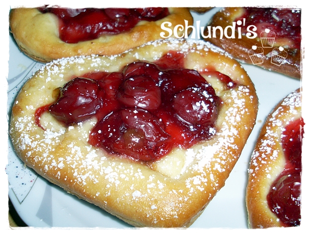 Dann auf jedes Herz 1-2 EL der Kirschpuddingmasse verteilen und noch einmal ca. 20-25 Min. gehen lassen.