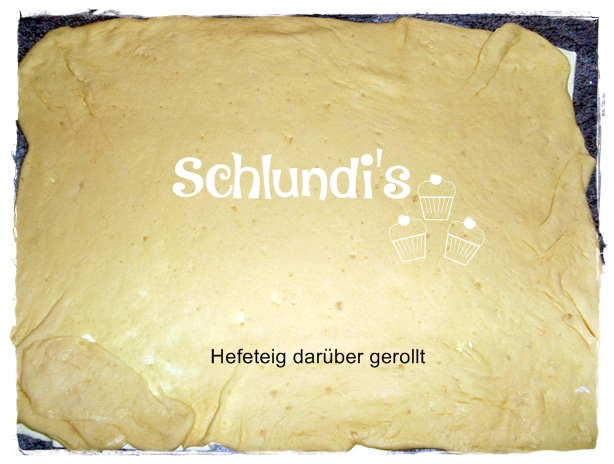 Blätterteig auf einer Arbeitsfläche ausrollen und mit der weichen Butter bestreichen, anschließend den Hefeteig ebenfalls ausrollen und darauflegen mit einer Teigrolle noch einmal drüberrollen.