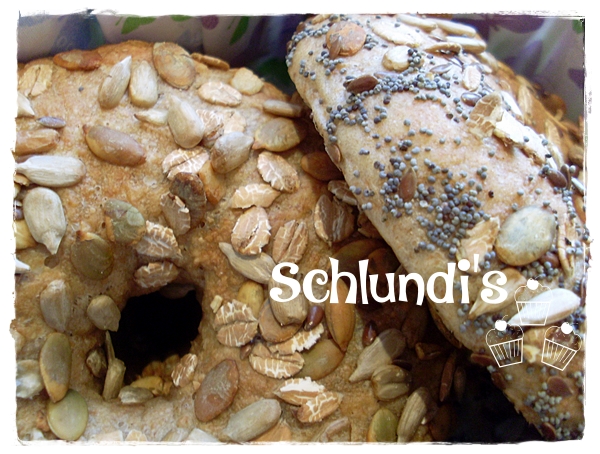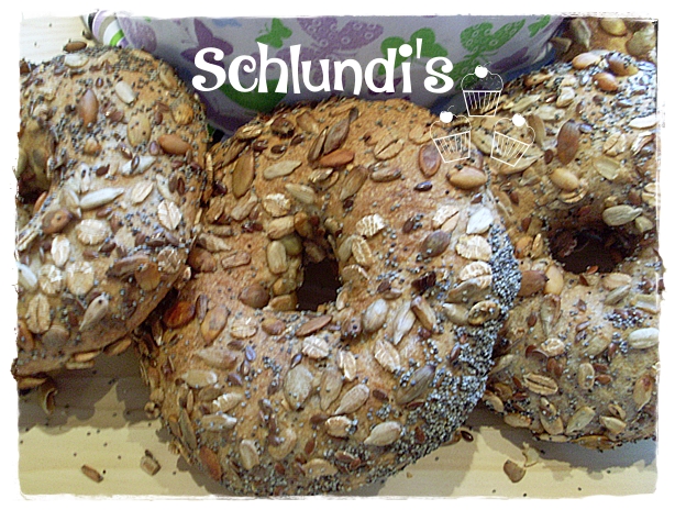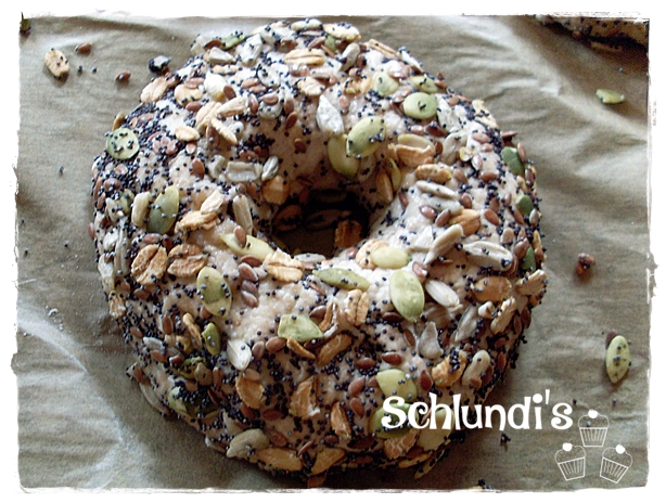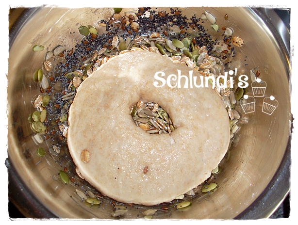 Ich hab mit den Fingern die Körner noch ein bisschen beigeschoben, beherzt in meine Schüssel gegriffen und den Bagel wieder mit der Körnerseite nach oben