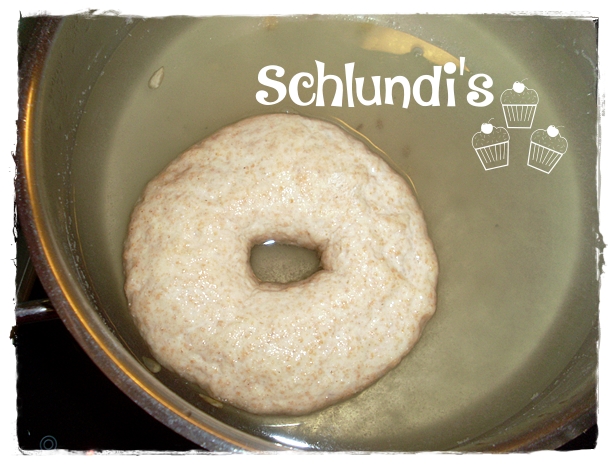 Die Bagels werden gesiedet, damit sie eine glatte Oberfläche bekommen und nicht aufreißen, (keinen Ausbund wie bei Brötchen, der ist hier nicht gewünscht) Die Oberfläche wird auch knuspriger je länger man sie siedet.