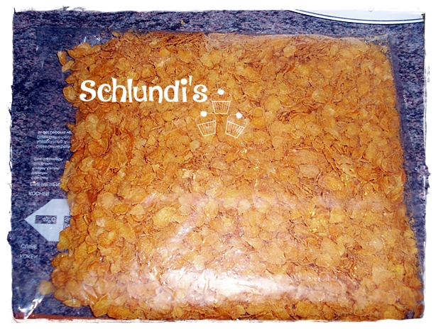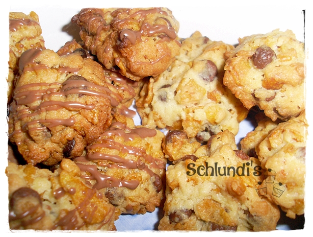 Dann die Cornflakes abwiegen und in einen Gefrierbeutel geben, mit der Handfläche oder Nudelholz etwas zerkleinern, sonst werden die Cookies zu „sperrig“ Die Cornflakes und Schokotropfen in eine Schüssel füllen und die Teigmasse darüber geben, mit einem Esslöffel gut vermengen, im Thermomix würden die Cornflakes zu arg zerkleinert beim Unterrühren und die Menge würde den Topf sprengen ;-).