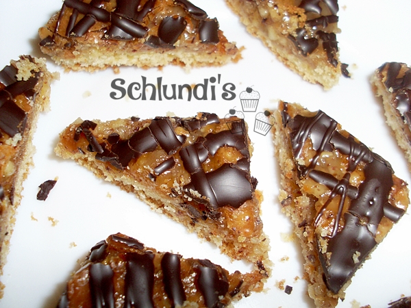 Wenn alles erkaltet ist (am besten am nächsten Tag) – den Kuchen zuerst in kleine Vierecke schneiden, diesen dann noch einmal schräg schneiden dass kleine Dreiecke entstehen.