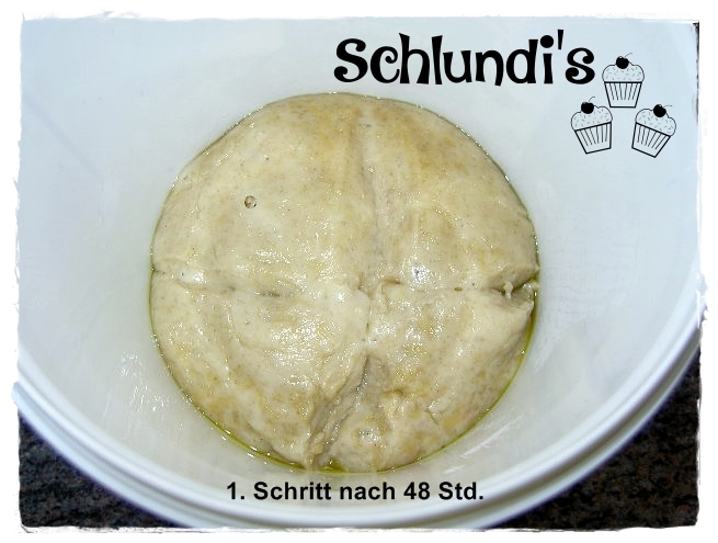 Diese Zutaten wieder zu einer Kugel verkneten, mit Olivenöl abreiben, kreuzförmig einschneiden in ein Glas oder Schüssel geben, mit Klarsichtfolie abdecken und erneut für 48 Std. stehen lassen.