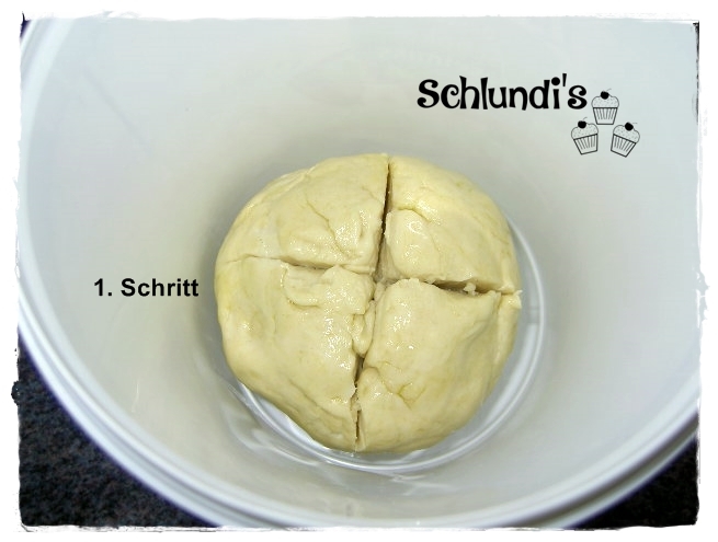 kreuzförmig einschneiden und in eine Schüssel oder Einmachglas geben, mit Klarsichtfolie abdecken. Und bei Raumtemperatur 48 Std. stehen lassen. Die Kugel sollte sich in ihrer Größe verdoppeln und leicht säuerlich riechen.