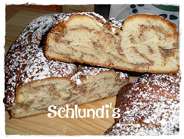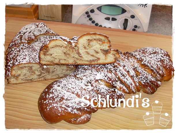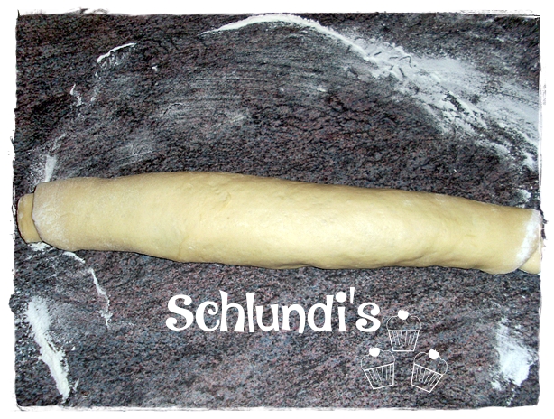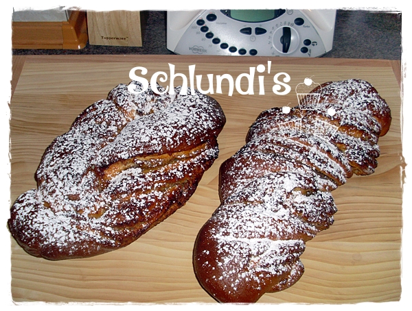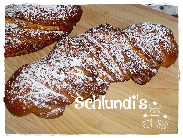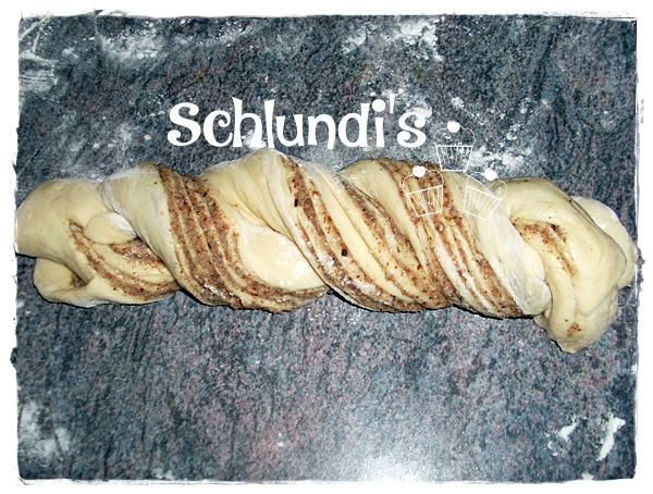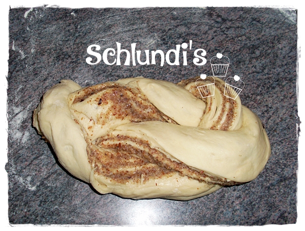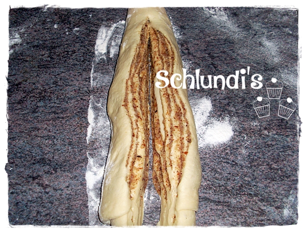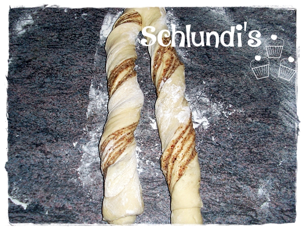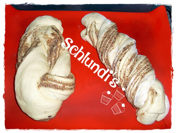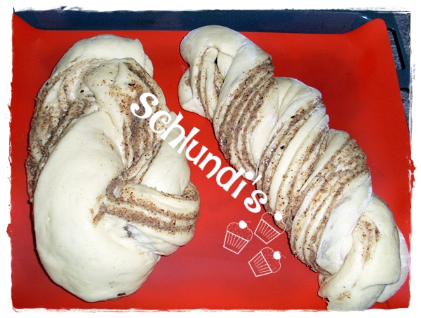 Ich habe 2 Varianten gebacken. Einmal nur locker Rechts-Links-Flechten und nach oben zusammen fügen. Bei der 2. Variante hab ich die beiden Hälften kräftig zu einem Korkenzieher gedreht und dann wie eine Spirale eng zusammengeschlungen.