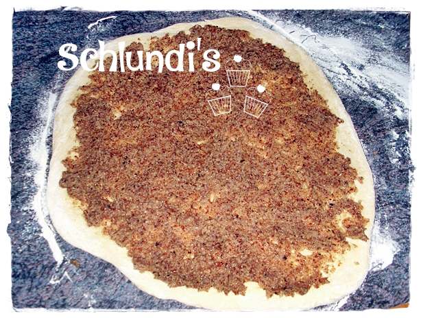 Teiglinge nacheinander ausrollen und mit der Fülle bestreichen.