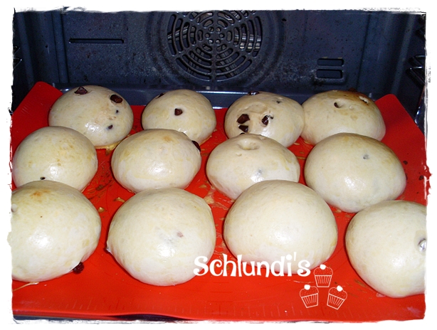 Je nach Wunsch, entweder Schokostücke, Sultaninen oder Cranberry in die Brötchen einarbeiten und auf ein mit Backpapier belegtes Backblech setzen