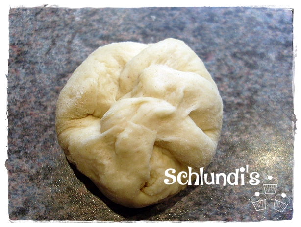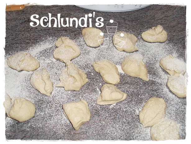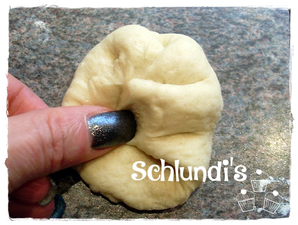 Teigling 10-12 mal falten und 5 Min. entspannen lassen, 20 kleine Teilinge abstechen, zu einem Fladen drücken und reihum über den Daumen einfalten, siehe Foto!