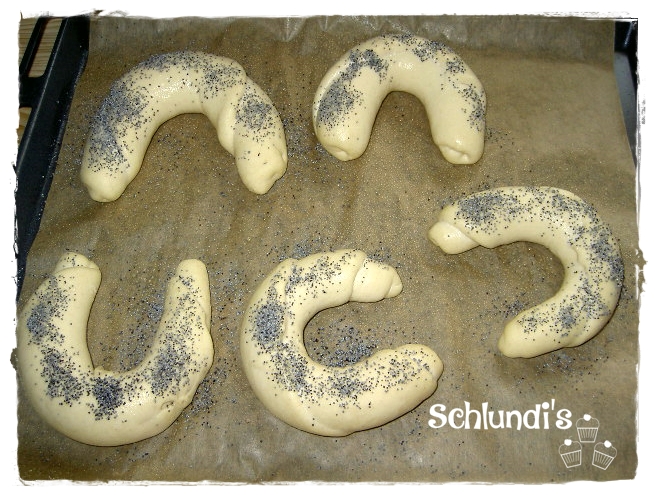 Wer mag kann einen Teil der Stangen zu Hörnchen biegen und mit Mohn bestreuen.