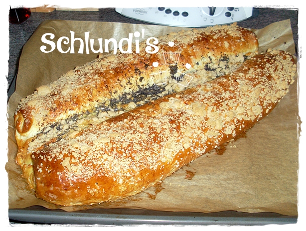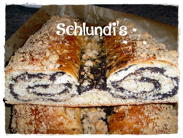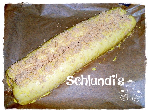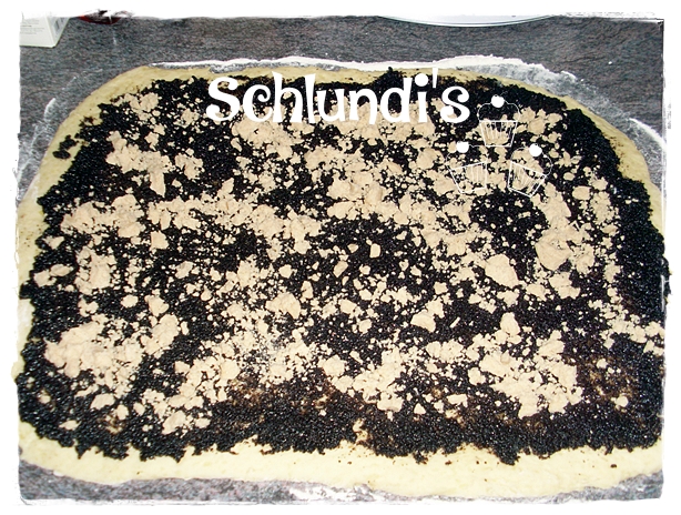 Dann den gegangenen Teig auf einer bemehlten Arbeitsfläche ca. backblechgroß aufrollen. Mit der Mohnfüllung bestreichen, die Hälfte der Streusel drauf verteilen und von der langen Seite aus jeweils rechts und links bis zur Mitte einrollen.