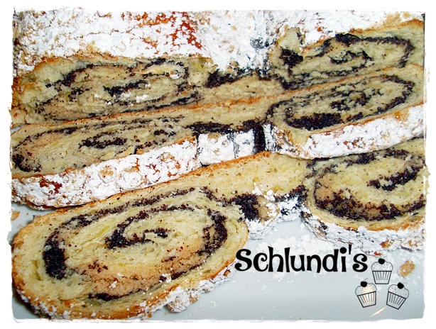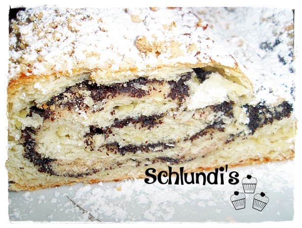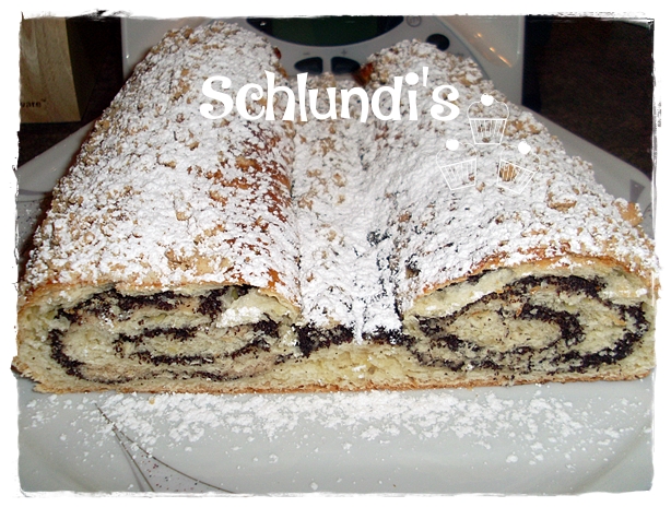 In der Zeit hab ich meine Mohnfüllung angerührt. Ich hatte eine in Pulverform, da mußte man nur noch Milch zugeben, ich hab noch ein Ei dazugegeben, damit sie geschmeidiger wurde.