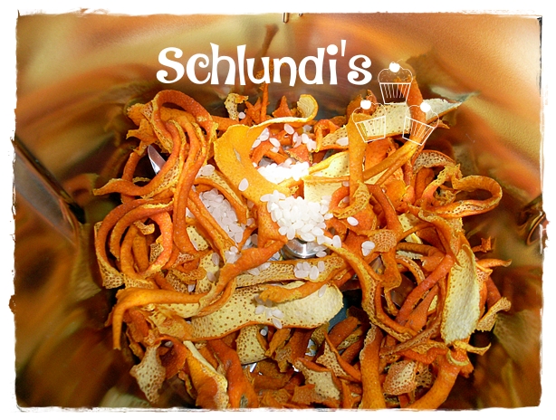 Ich hatte mir ja eine Kiste Bioorangen aus Mallorca schicken lassen und es wäre ja zu schade gewesen die Schalen wegzuwerfen. Im übrigen mach ich immer ein paar Körner Milchreis mit in den Orangen -/Zitronen oder Vanillezucker – damit er nicht klumpt. Andere machen es nicht, kann jeder machen wie er will, meins klumpt auf alle Fälle nicht und Milchreis in der kleinen Menge schadet nicht und ist auch nichts unnatürliches oder schädliches. Ich wollt nur nochmal drauf hinweisen.