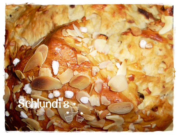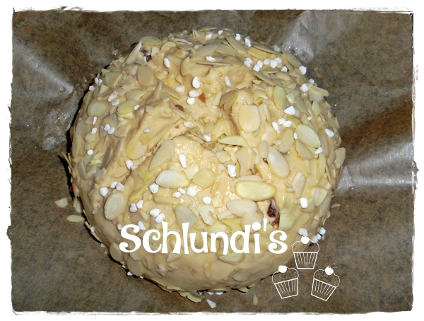 Teig dann auf ein mit Backpapier ausgelegtes Backblech legen. Kreuzförmig einschneiden, mit der Eiermilch bepinseln, Hagelzucker und Mandelblättchen drauf streuen und noch einmal 20-30 Min. ruhen lassen.