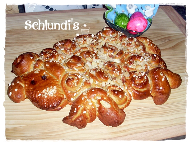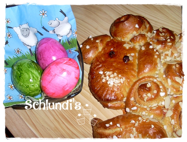 Das Lämmchen mit der Eiermilch bepinseln, mit Hagelzucker und Mandelblättchen bestreuen. Nochmal ca. 20 Min. ruhen lassen.