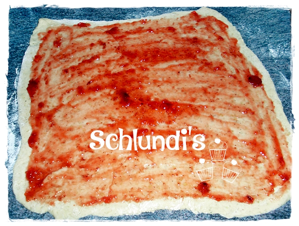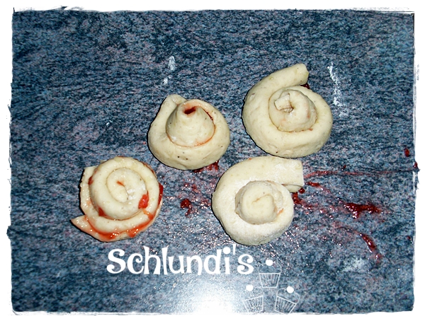 Die größere Teigkugel ausrollen und dünn mit der Marmelade bestreichen, dann wie auf dem Foto in Streifen schneiden. Die einzelnen Streifen einrollen und zu Schnecken formen.