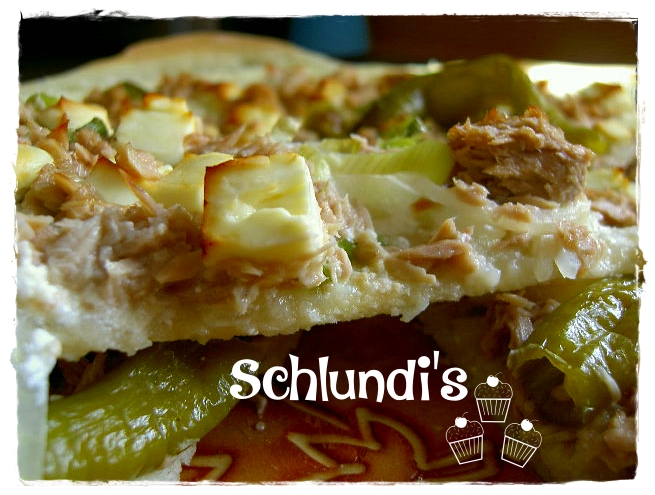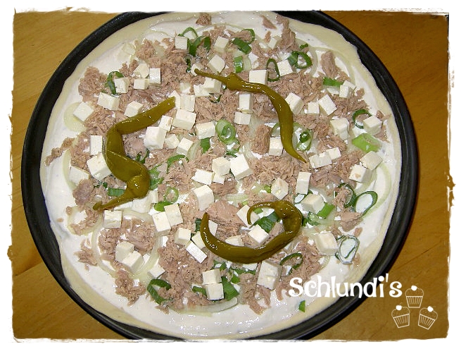 Die Schmand-Creme fraiche-Masse aufstreichen und mit den übrigen Zutaten belegen, auf jede Pita 3 Peperonis legen und im Backofen bei 200° Umluft 20-25 Min. backen.