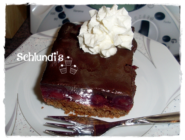 Kirschen derzeit auf dem ausgekühlten Boden verteilen – Puddingmasse nach Fertigstellung sofort darüber geben und evtl. glatt streichen.