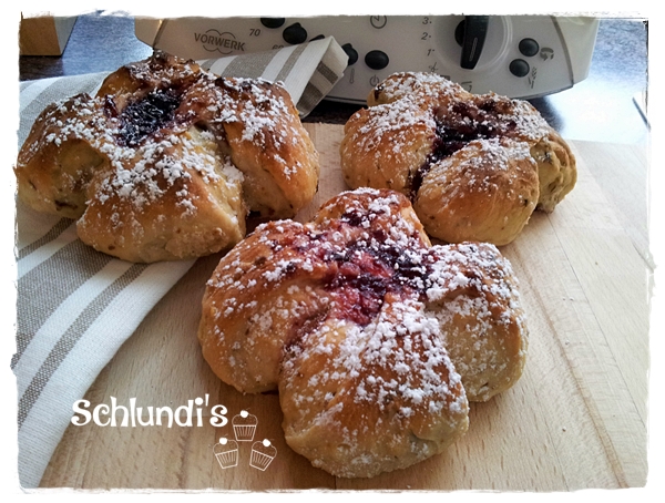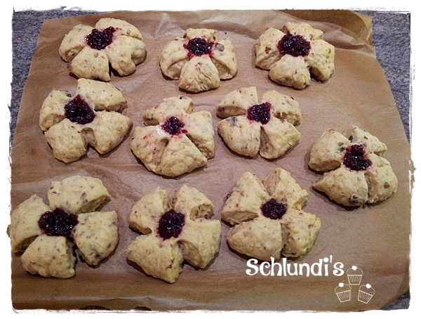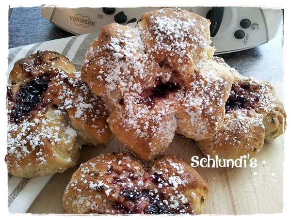 Den Teigling auf eine bemehlte Arbeitsfläche kippen und mehrfach falten, 10 Brötchen abstehen, rund schleifen. Dann in der Mitte mit dem Daumen oder einem Kochlöffelstil ein Loch eindrücken, an allen 4 Seiten der Brötchen mit einem Messer einschneiden und in das Loch einen Klecks rote Marmelade füllen.