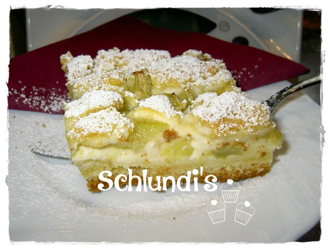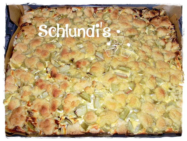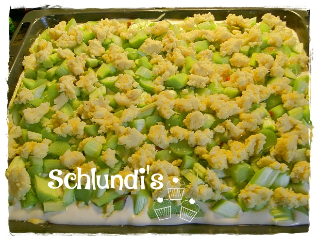 Dann den geputzen und in kleine Stücke geschnittenen Rhabarber drauf verteilen, und den Zupfer drüber geben.
