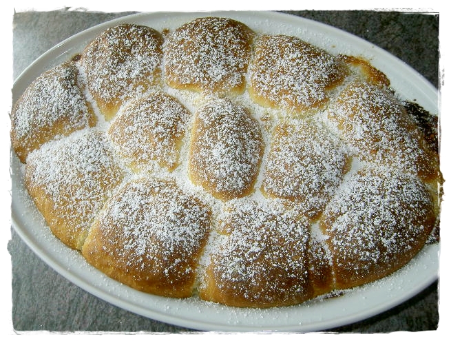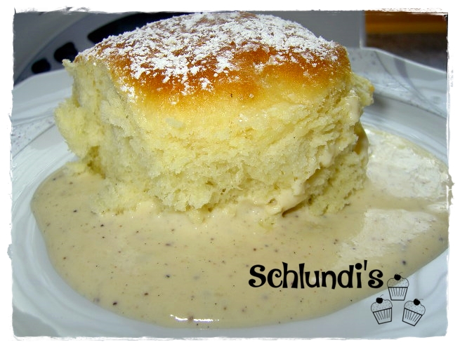 Den Guss über die gegangenen Rohrnudeln/Buchteln/Germknödel gießen und bei 175° Umluft ca. 20-25 Min. backen. Mit Puderzucker besteuen und mit einem Spiegel aus Vanillesoße anrichten.