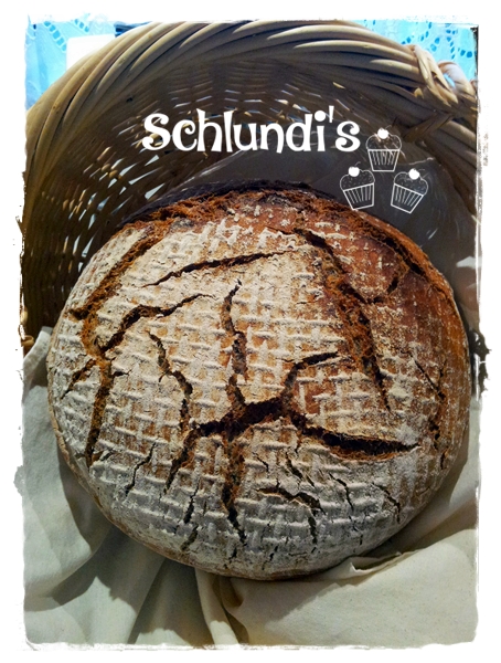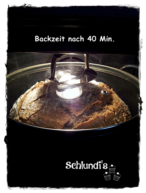Nachdem der Ofen und der Topf gut vorgeheizt sind, Topf aus dem Ofen nehmen, auf ein Holzbrett o.ä. was die Hitze verträgt stellen Teigling vom Gärkörbchen mit Schwung in den in den Topf gleiten lassen. Deckel drauf und sofort wieder in den Backofen stellen. Backzeit beträgt ca. 1 Stunde bei 230°, nach ca. 40 Minuten den Deckel abnehmen und ohne Deckel fertig backen.