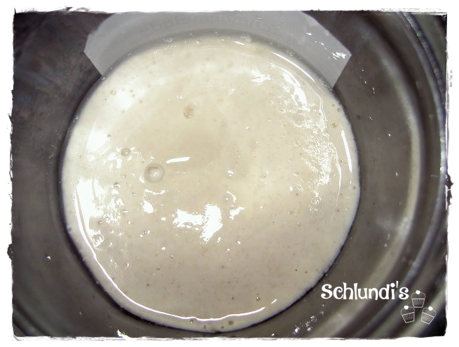 Teig wieder mit 50g Mehl und 50g lauwarmen Wasser „füttern“, glatt rühren und mit Klarsichtfolie wieder an einem warmen Ort stehen lassen.