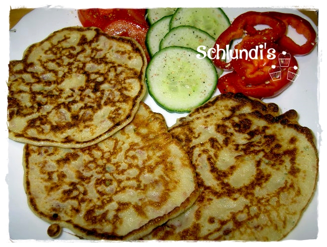 Den Teig ein paar Minuten ruhen lassen und kleine Omelettes ausbacken, der Teig läßt sich auch gut in einem Waffeleisen zubereiten. Die Omelettes schmecken warm zu Salat oder auch kalt als Fingerfood.