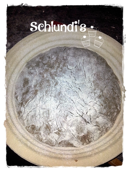 Den Teigling nach der Ruhephase auf eine bemehlte Ablage kippen und mit einer Teigkarte und etwas Mehl so gut es geht falten – der Teig ist super klebrig, ich sags gleich – nicht leicht zu händeln. Den Teig dann in ein bemehltes Gärkörbchen mit dem Schluss nach unten legen und nochmal ca. 30-45 Min. gehen lassen. Wer nicht so gerne mit diesen feuchten Teigen bäckt, kann diesen auch in einen Backrahmen geben und dort noch einmal gehen lassen und backen.