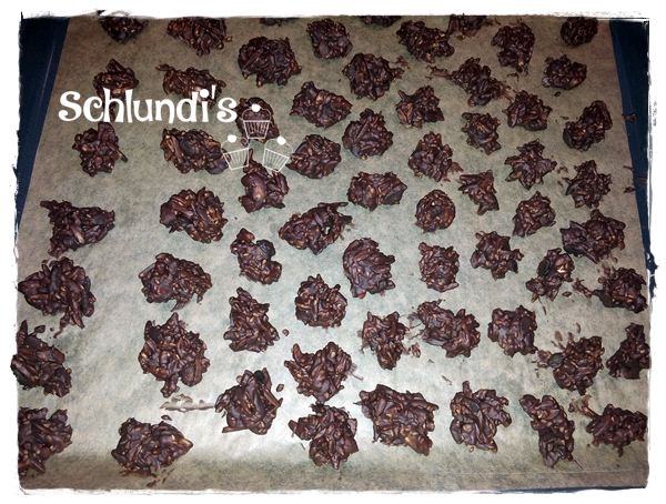 Die Nuss-Kerne-Mischung in eine Schüssel geben und die flüssige Schokolade darübergießen. Gründlich vermengen und mit Hilfe von 2 Teelöffeln kleine Häufchen abstechen und auf Backpapier setzen.