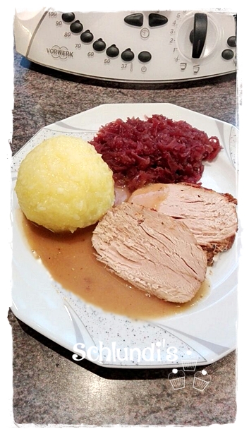 Wir hatten dazu Klöße und Blaukraut – Rotkohl.